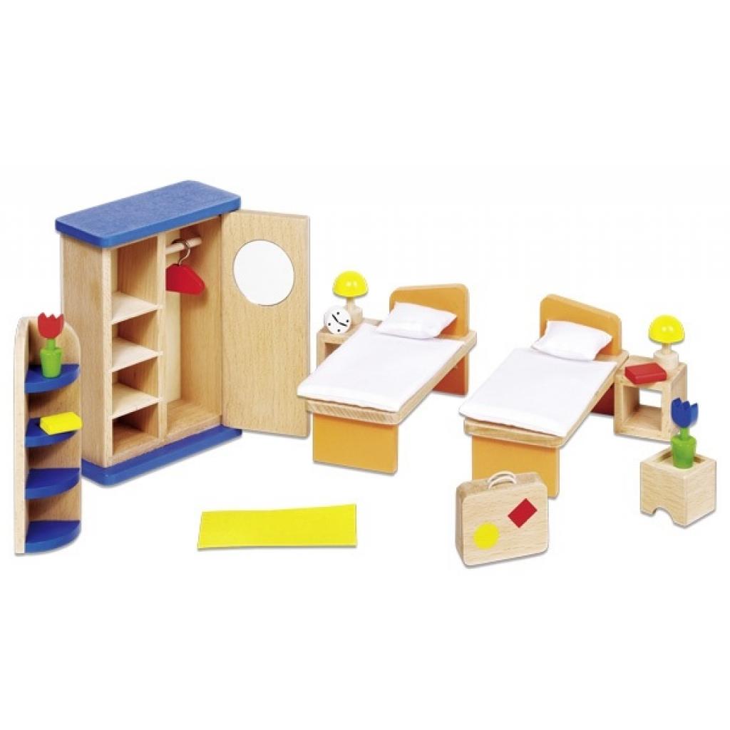 Чудовий набір меблів для лялькової спальні від німецького бренду goki. У комплект входить: шафа, кутова полиця, два ліжечка, тумбочки, лампи, горщики з квітами, годинник, валіза та текстильні елементи – постіль і килимок. Набір ідеально підходить до лялькових будиночків goki, він урізноманітнить гру із ляльками, яка так корисна для дівчат віком від 3-х років. Деталі вироблені із натурального дерева, вкритого безпечними фарбами на водній основі.