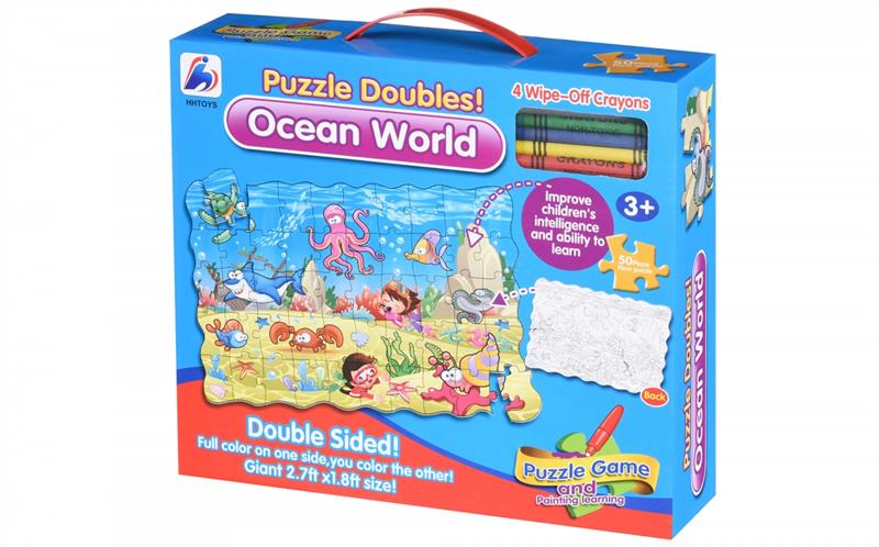 «Підводний світ» – незвичайний пазл для дітей від трьох років. Це водночас розвивальна іграшка і набір для творчості. Пазл складається з 50 фрагментів. На лицевій стороні деталей – яскраві зображення, нанесені якісними фарбами. На звороті – те ж зображення, тільки чорно-біле. Перед дитиною завдання – зібрати пазл. А перевернувши зібрану картинку на «чорно-білу» сторону, можна її розмалювати. Для цього в наборі 4 кольорові воскові олівці. З допомогою такої гри діти розвиватимуть моторні навички, покращуватимуть пам'ять і уважність.