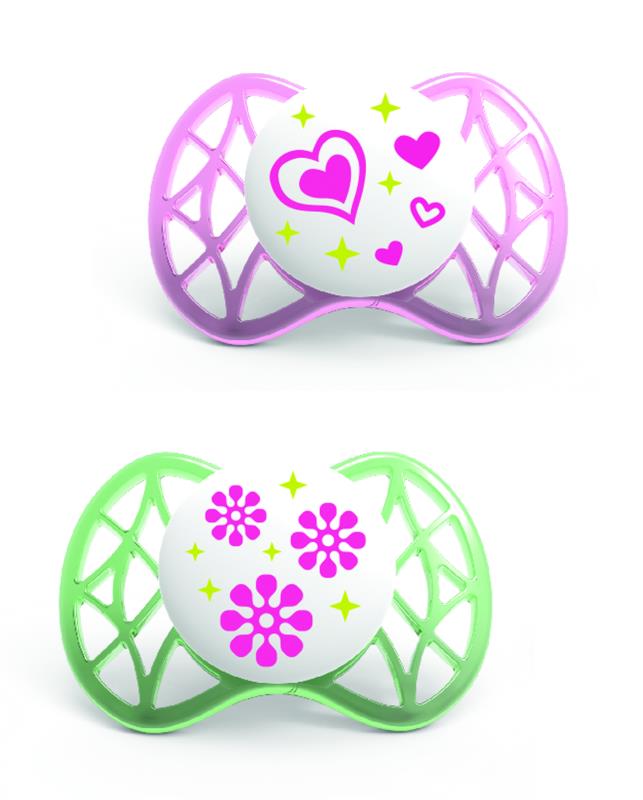 Набір з двох ортодонтичних пустушок. Пустушки такого типу розміщується у ротовій порожнині більш зручно для дитини і сприяють формуванню правильного прикусу. Виготовлені з безпечних матеріалів. Підходять для дітей з народження.