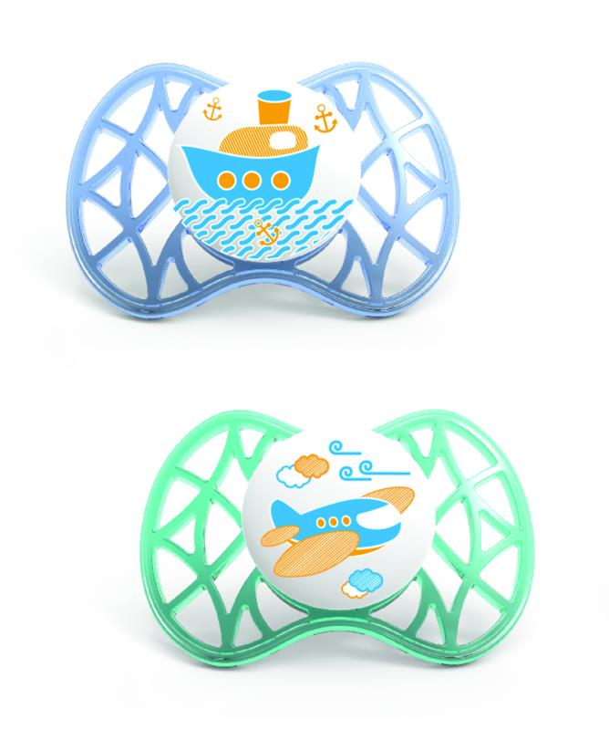 Дві ортодонтичні пустушки від італійського бренду Nuvita. Це чудовий засіб як для заспокоєння дитини, так і для формування правильного прикусу. Сосочок вироблений із безпечного матеріалу – силікону. Зовнішня частина прикрашена корабликами та літаками, вона майже невагома і забезпечує вільну циркуляцію повітря. Захисний ковпачок допоможе зберегти пустушку чистою або простерилізувати її в мікрохвильовці, додавши воду всередину.