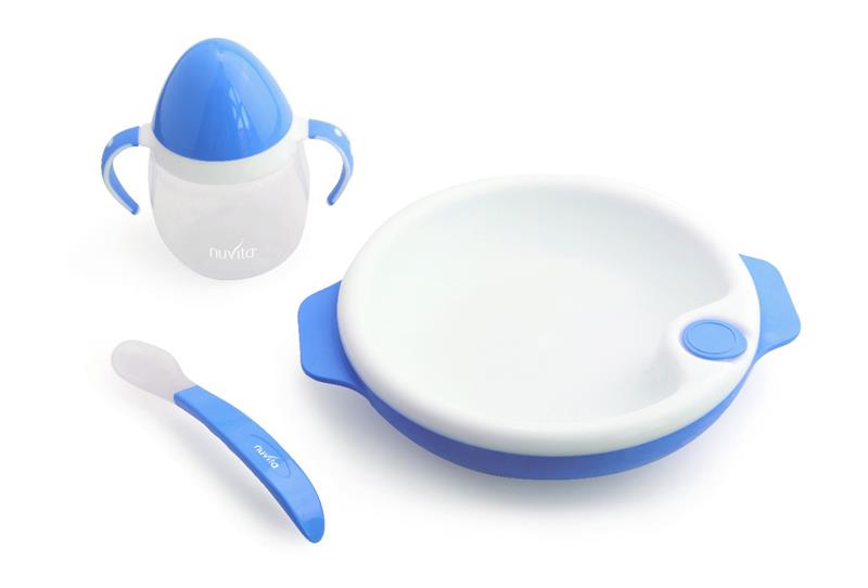 Набір для годування із 3-х предметів блакитного кольору від італійського виробника Nuvita. У наборі: тарілочка з підігрівом, ложечка та пляшечка. Набір навчить дитину користуватись основними столовими предметами. Тарілочка із нековзним дном, вона оснащена отвором, у який заливається кип’яток, який зберігатиме їжу теплою. Ложечку із силіконовою вставкою дуже зручно тримати у руках. Пляшечка із силіконовим носиком та ергономічними ручками з обох боків для надійного тримання. Не містить бісфенол-А. Рекомендовано малюкам з 6 місяців, щоб привчати харчуватись самостійно.