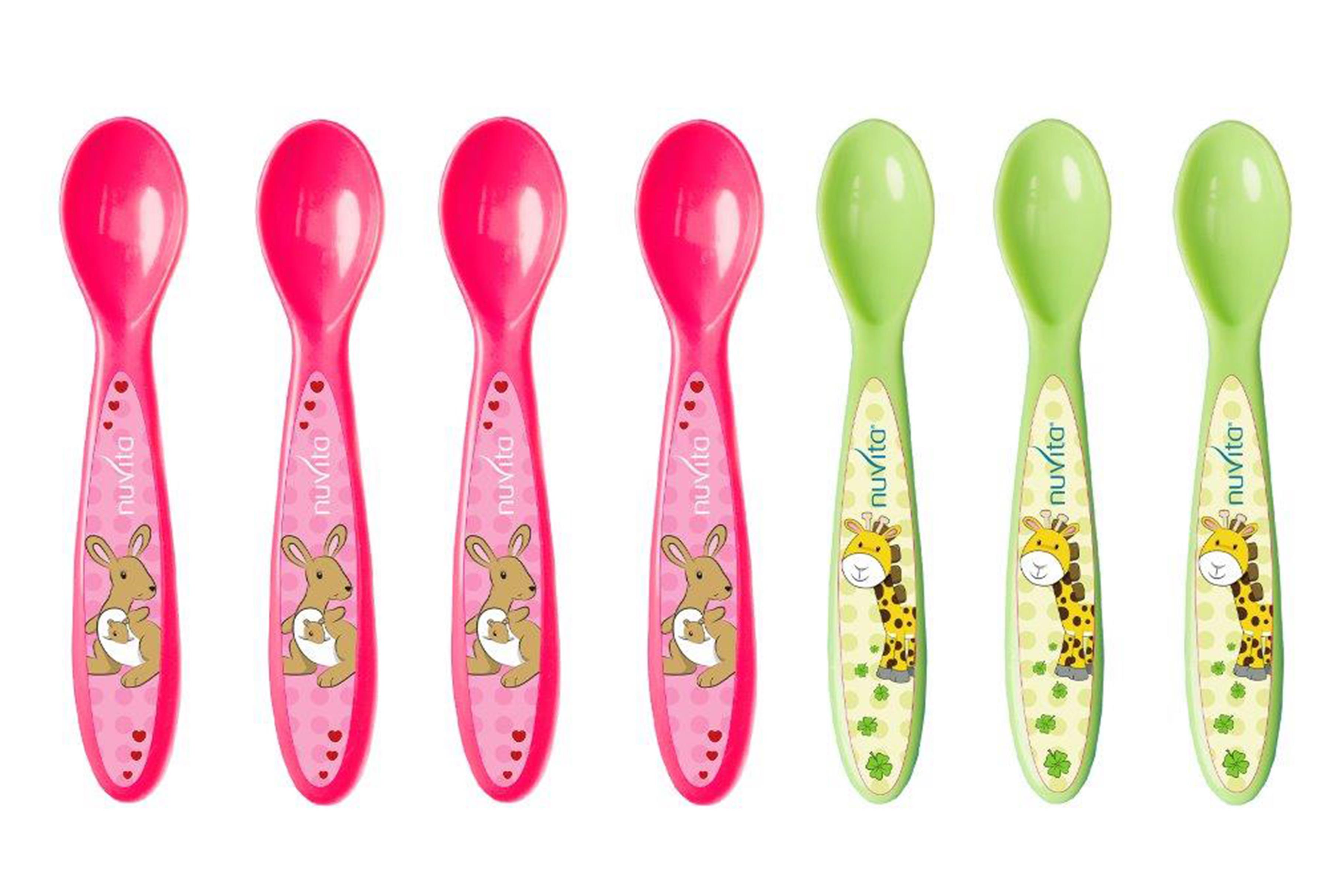 Італійський бренд Nuvita пропонує яскравий набір ложечок для дитячого харчування. У комплекті 7 ложечок: 4 рожеві з малюнком кенгуру і 3 зелені з малюнком жирафа. Прилади оптимального розміру та зручної форми для маленьких дитячих ручок. Вони вироблені із безпечного пластику, що не містить бісфенол-А. Ложечки можна мити у посудомийній машині. Для малюків з 6 місяців.