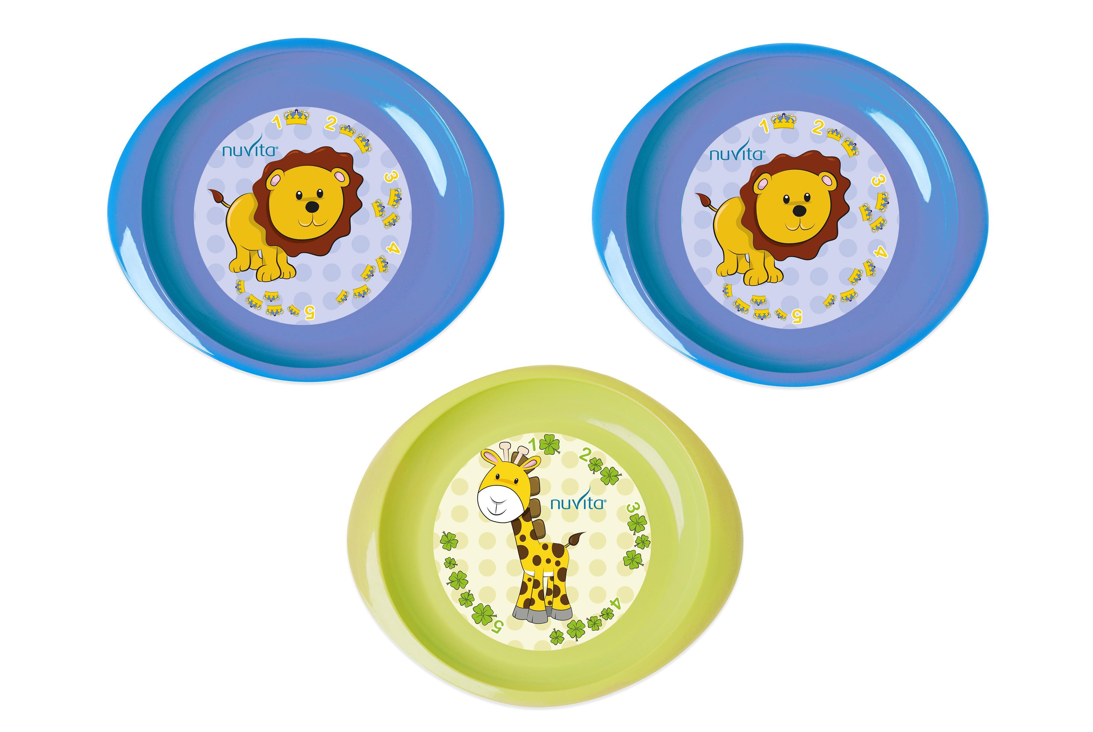 Набір яскравих та розвиваючих тарілочок від італійського бренду Nuvita. У наборі 3 пласкі тарілочки: 2 блакитного кольору та 1 салатового. Їх особливість – яскраві малюнки лева, жирафа та цифр, що відповідають кількості корон та листочків. Із таким набором дітлахи в ігровій формі навчаться основам математики. Тарілочки вироблені із міцного та безпечного пластику, що не містить бісфенол-А і фталати. Рекомендовано малюкам з 6 місяців.