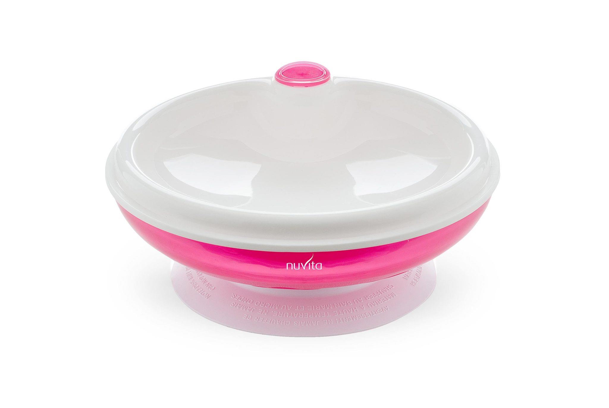 Тарілочка з підігрівом рожевого кольору для немовлят, розроблена італійським брендом Nuvita. Вона оснащена невеличким отвором, у який заливається гаряча вода для утримання дитячого харчування в теплі. Тарілочка із нековзним дном буде впевнено стояти на поверхні стола. Вироблена із міцного і безпечного пластику, який не містить у складі бісфенол-А та фталати. Для немовлят з 6 місяців.