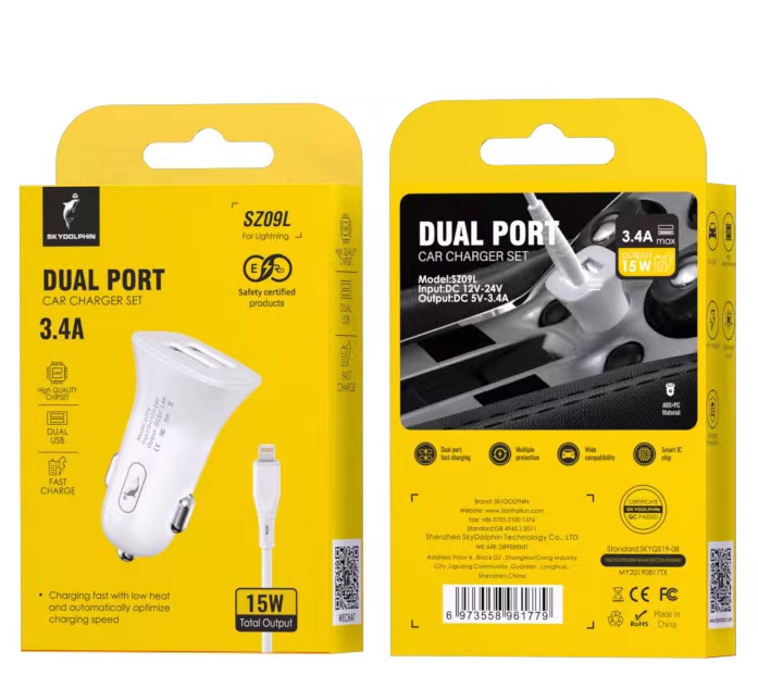 Автомобільний зарядний пристрій SkyDolphin SZ09L (2USB, 3.4A) White (AZP-000108) + кабель Lightning