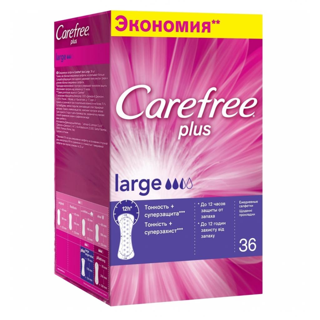 Жіночі гігієнічні прокладки Carefree Large на кожен день. Завдяки великим розмірам цих прокладок, Ви ще надійніше захищені від запахів і зберігаєте відчуття свіжості ще довше, ніж із звичайними прокладками. Вони допомагають захистити від виникнення запаху протягом цілих 12 годин і зберегти відчуття свіжості в будь-якій ситуації. Ці м'які щоденні прокладки точно повторюють лінії тіла, а завдяки спеціальному клейкому покриттю вони не мнуться і не зміщуються. Ви їх практично не будете відчувати, відчуваючи тільки свіжість і насолоджуючись життям. Відчуйте найбільш надійний і тривалий захист.