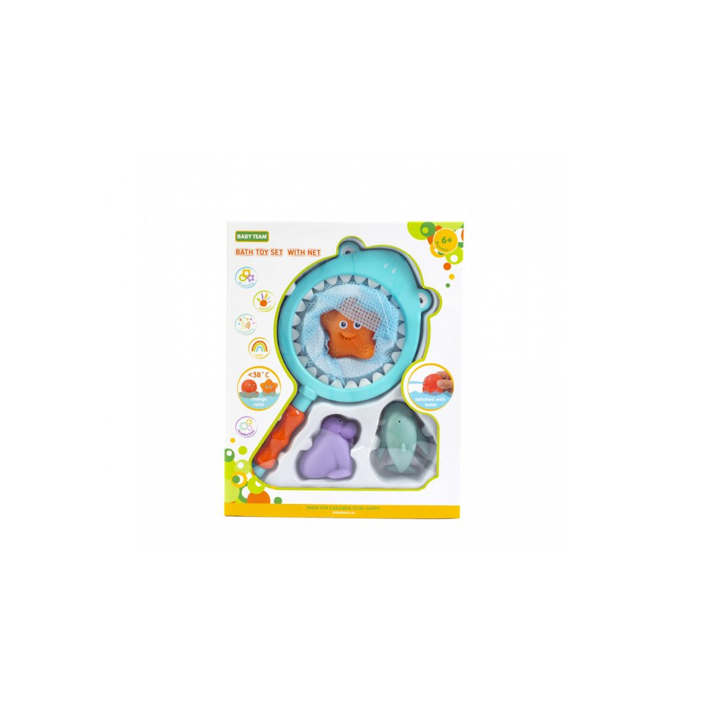 Іграшка розважає малюка, розвиває координацію рухів, дрібну моторику та колірне сприйняття. Після гри у ванні необхідно ретельно висушити. У наборі сачок та 3 іграшки, які бризкаються водою. А одна з них змінює колір, якщо температура води вище 38 С. Іграшки Baby team виготовлені з високоякісних та безпечних матеріалів, а також не містять шкідливих речовин та Бісфенол А. Матеріал: пластик, вініл Рекомендований вік: від 6 місяців.