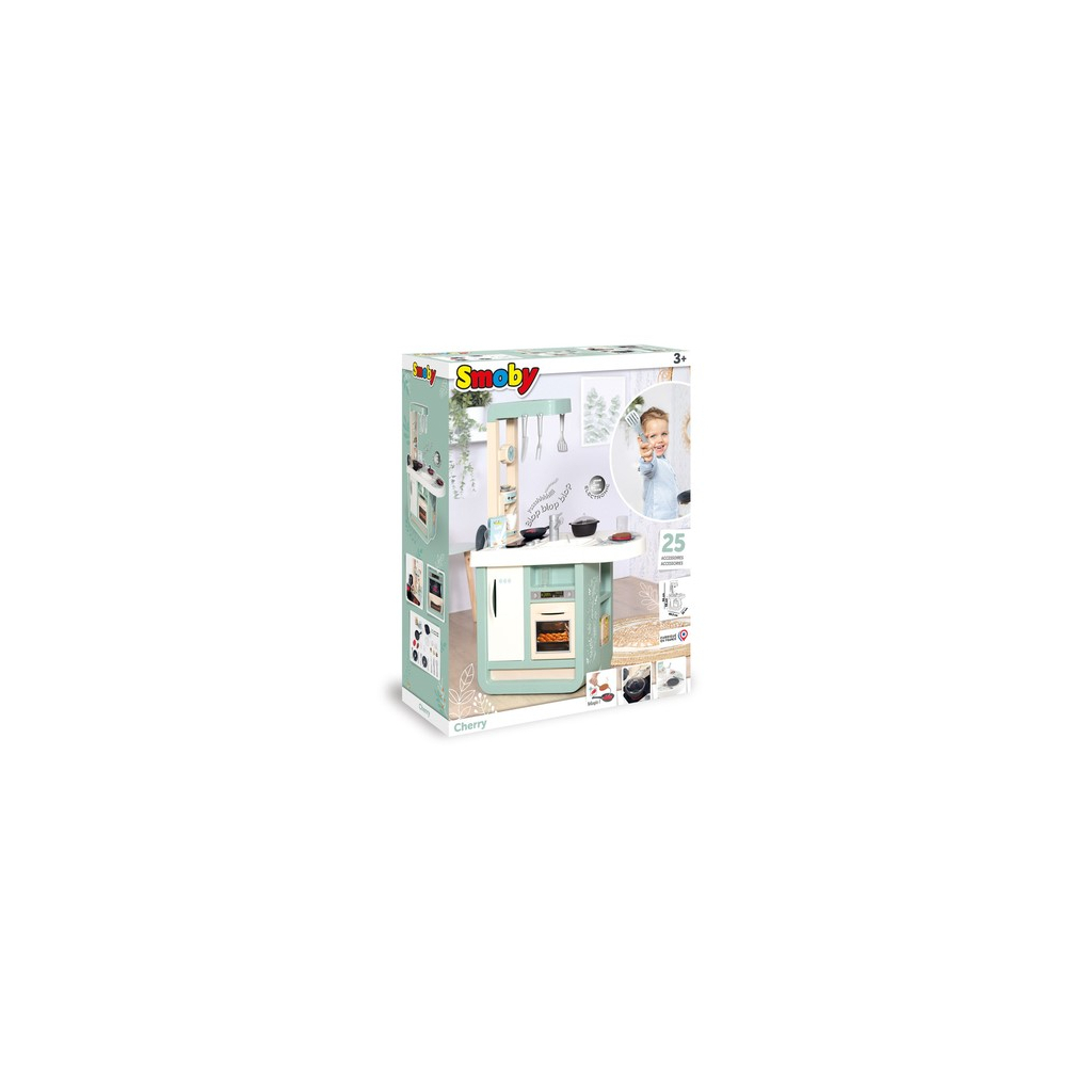 | У комплекті: | інтерактивна кухня "Черрі", 1 конфорка плити зі звуковими ефектами, духова шафа, холодильник, витяжка, мийка з краном, подовжена стільниця, еспресо машина з капсулами, безліч поличок для зберігання аксесуарів, 25 аксесуарів: каструлька з кришкою, тарілки, столові прилади, сковорода, чашки, риба та м'ясо (одна сторона підсмажена, інша сира) та інше |