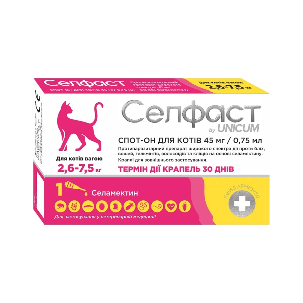 Краплі для тварин Селфаст від бліх, кліщів та гельмінтів на холку для котів 2.6-7.5 кг (4820275971449)