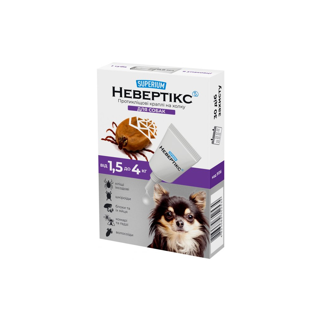 Краплі для тварин SUPERIUM Nevertix Протикліщові для собак від 1.5 до 4 кг (9136)