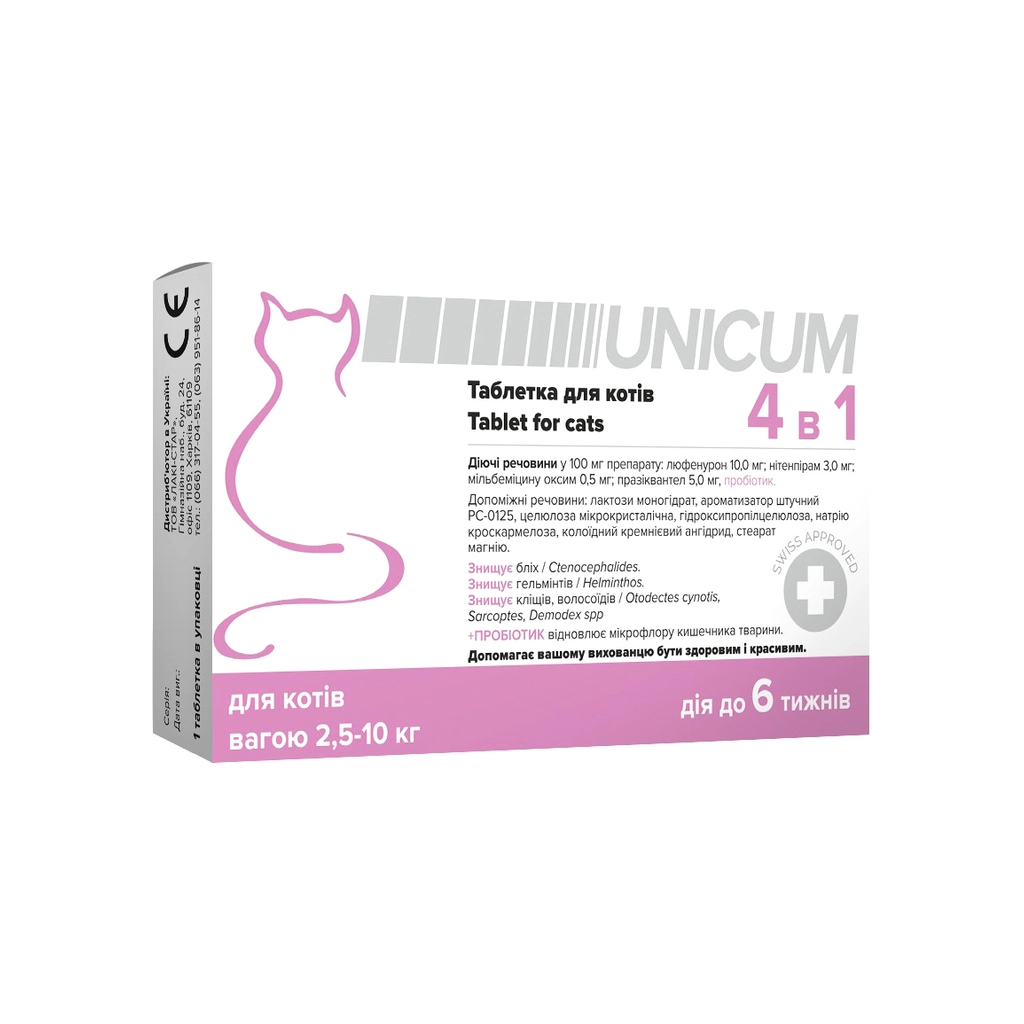Краплі для тварин Unicum 4 в 1 від бліх, кліщів, гельмінтів з пробіотиком для котів 2.5-10 кг (4820275970299)