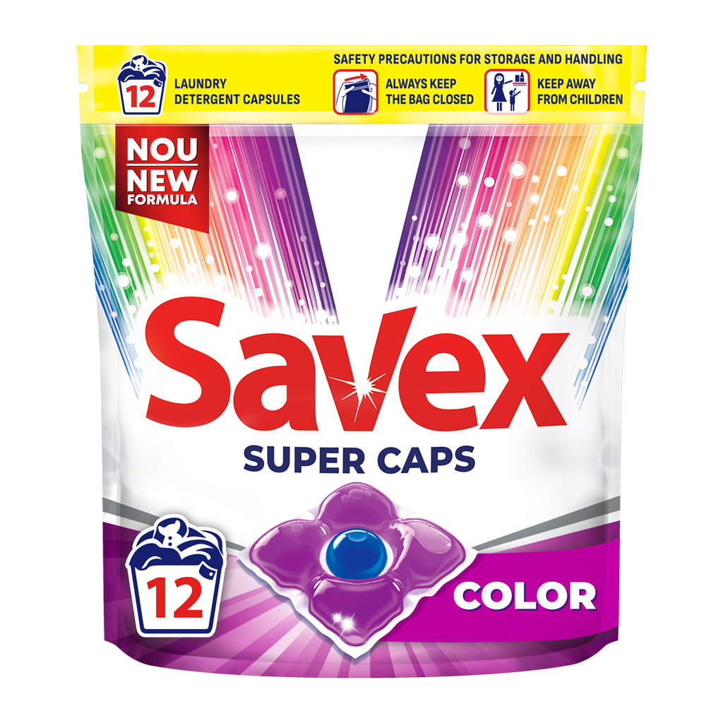 | Додатково: | Savex Super Caps Color з чудовою новою формулою. Активатором яскравості та підсилювачем активних компонентів. Має оптичний відбілювач, який робить білий колір помітно білішим, а решта кольорів яскравіша завдяки спеціальному полімерному активатору фіолетового кольору. |