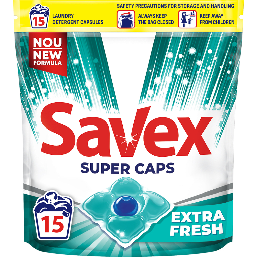 | Додатково: | Новий Savex Super Caps з чудовою новою формулою. Активатор яскравості та підсилювач активних компонентів. Має оптичний відбілювач, який робить білий колір помітно білішим, а інші кольори яскравішими завдяки спеціальному полімерному активатору фіолетового кольору.. |