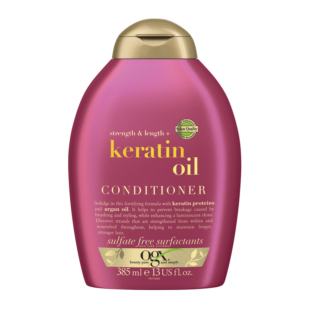 Кондиціонер проти ламкості волосся OGX з кератиновою олією, збагачений протеїнами кератину та олією аргани, доглядає за волоссям після застосування шампуню. Допомагає уникнути появи посічених кінчиків, робить волосся гладким, зволожує і надає йому сили. Кондиціонер перешкоджає ламкості волосся, що викликана розчісуванням, укладанням та стайлінгом. Засіб догляду за волоссям має приголомшливий аромат, який допомагає зануритися у світ задоволення та насолоди.