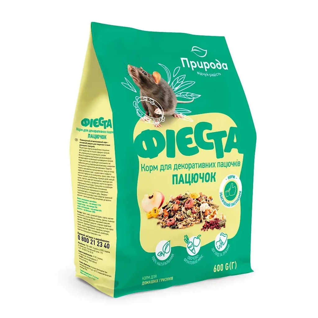 Пацючки мають харчуватися різноманітно, тому до складу корму включені маїс, сушені овочі та фрукти, насіння гарбуза та соняшнику, просо, овес, ягоди. Таким чином улюбленець отримує калій, кальцій, цинк, залізо, магній та вітаміни, необхідні для міцного імунітету, тривалого життя та гарного зовнішнього вигляду. Грануляти та комбікорм забезпечують улюбленців клітковиною, необхідною для нормального травлення, і допомагають сточувати зуби. Завдяки герметичній упаковці корм зберігає приємний аромат і захищений від шкідливої дії вологи.