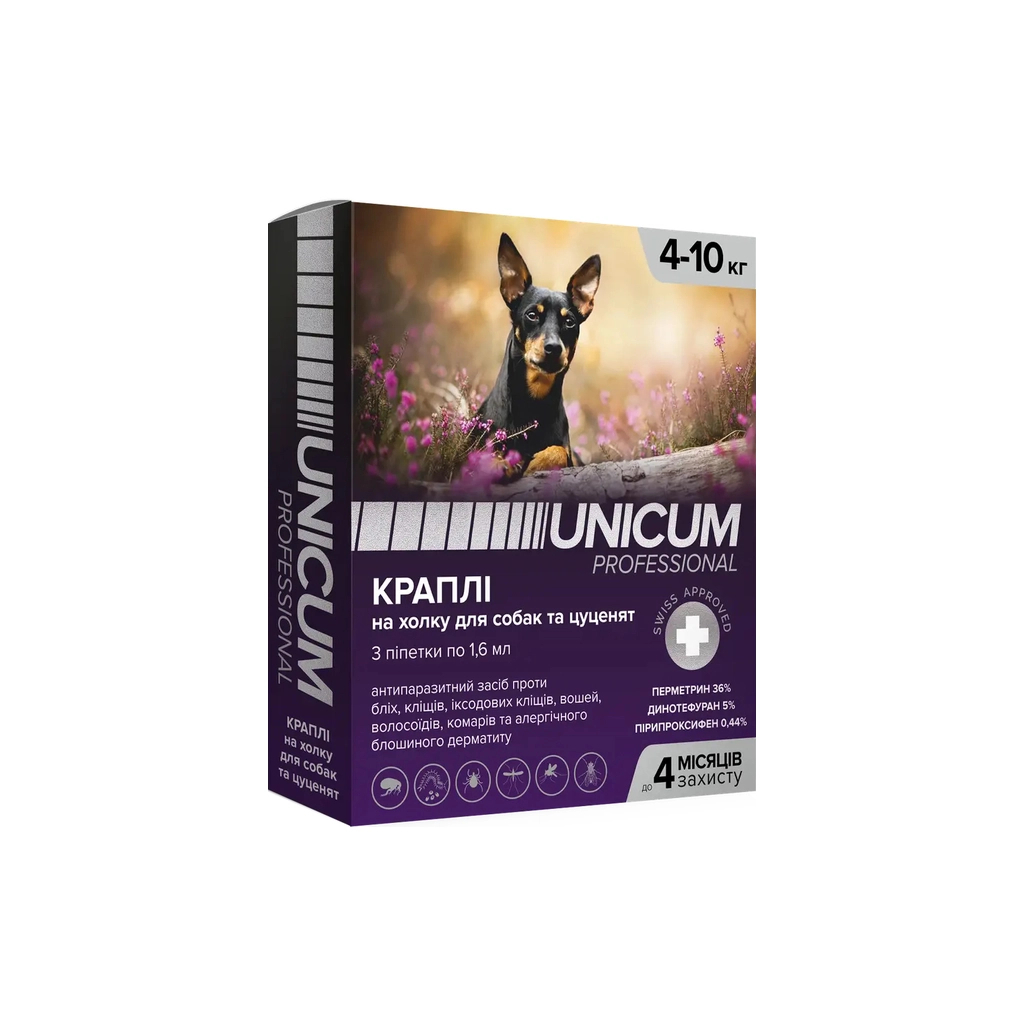 Краплі для тварин Unicum Pro від бліх, вошей, волосоїдів, комарів, москітів, іксодових кліщів для собак 4-10 кг/3 шт (4820150206529)
