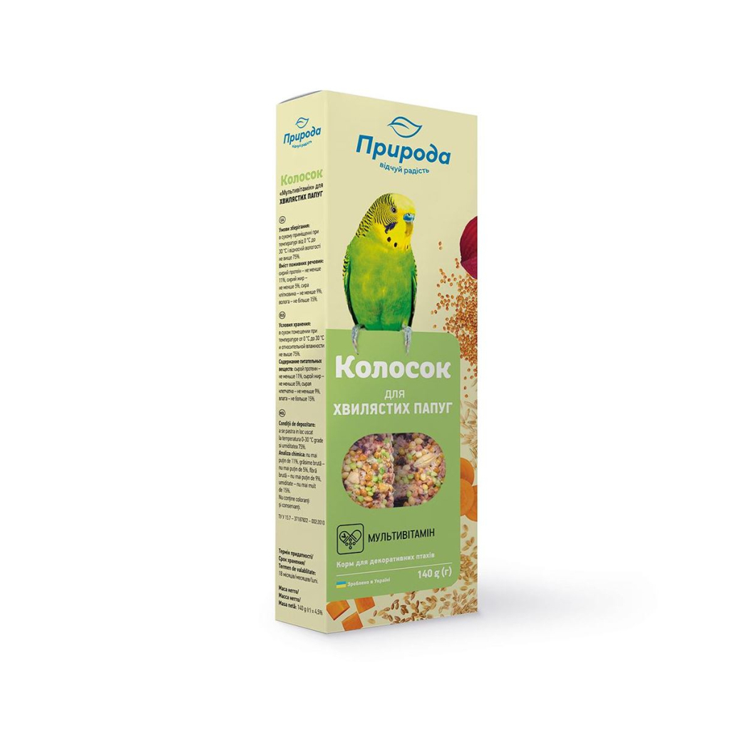 Повноцінні вітамінізовані ласощі мають високу поживну цінність і смакові якості завдяки спеціальній технології обробки інгредієнтів. Склад колосків наближений до їжі папуг в природних умовах. Добірні зерна забезпечують птахів енергією. Сушені за спеціальною технологією овочі та фрукти зберігають максимальну кількість корисних речовин. Ласощі позитивно впливають на травлення птахів, а це забезпечує чудову кондицію та рухливість.