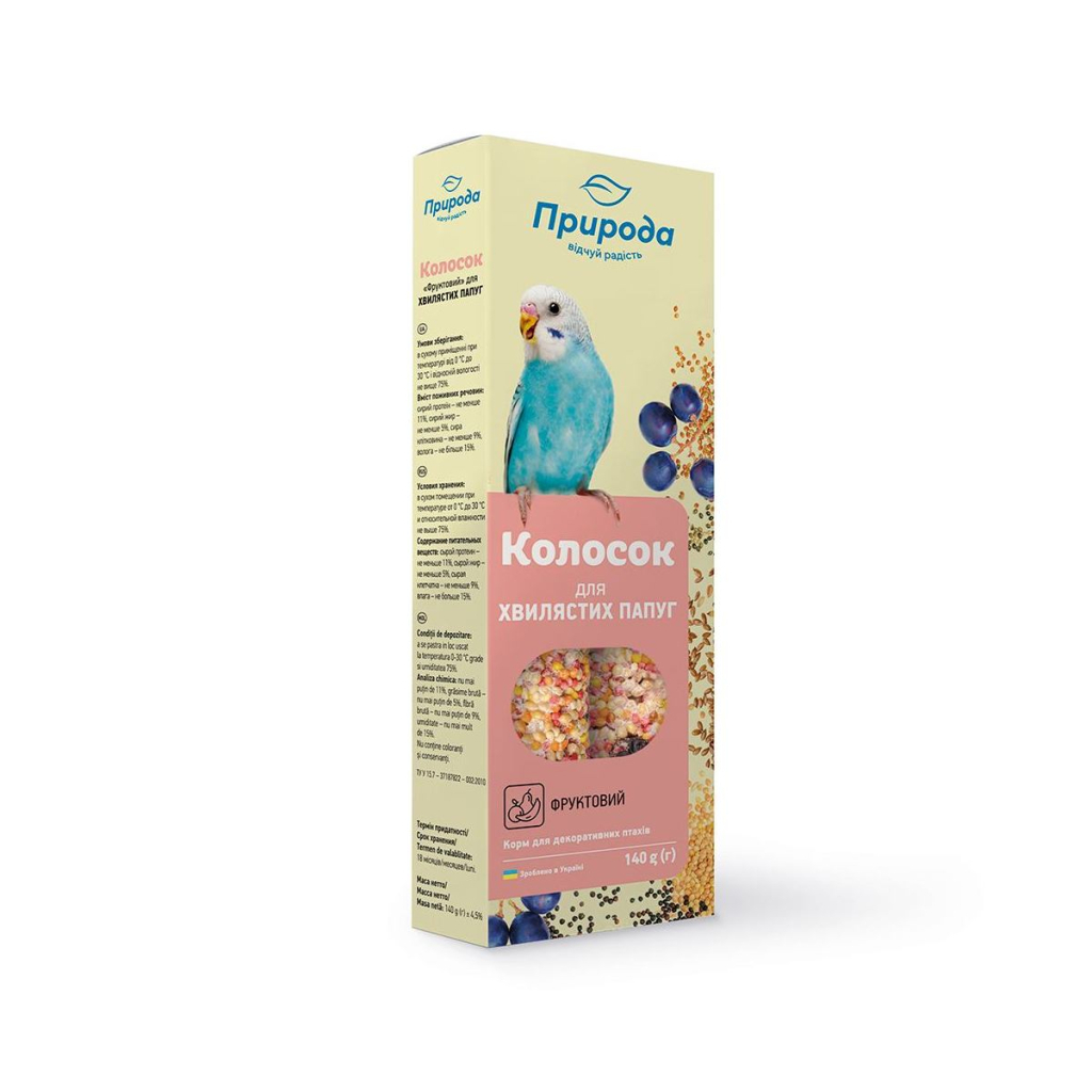 Повноцінні вітамінізовані ласощі мають високу поживну цінність і смакові якості завдяки спеціальній технології обробки інгредієнтів. Склад колосків наближений до їжі папуг в природних умовах. Добірні зерна, забезпечують птахів енергією. Сушені за спеціальною технологією овочі та фрукти зберігають максимальну кількість корисних речовин.