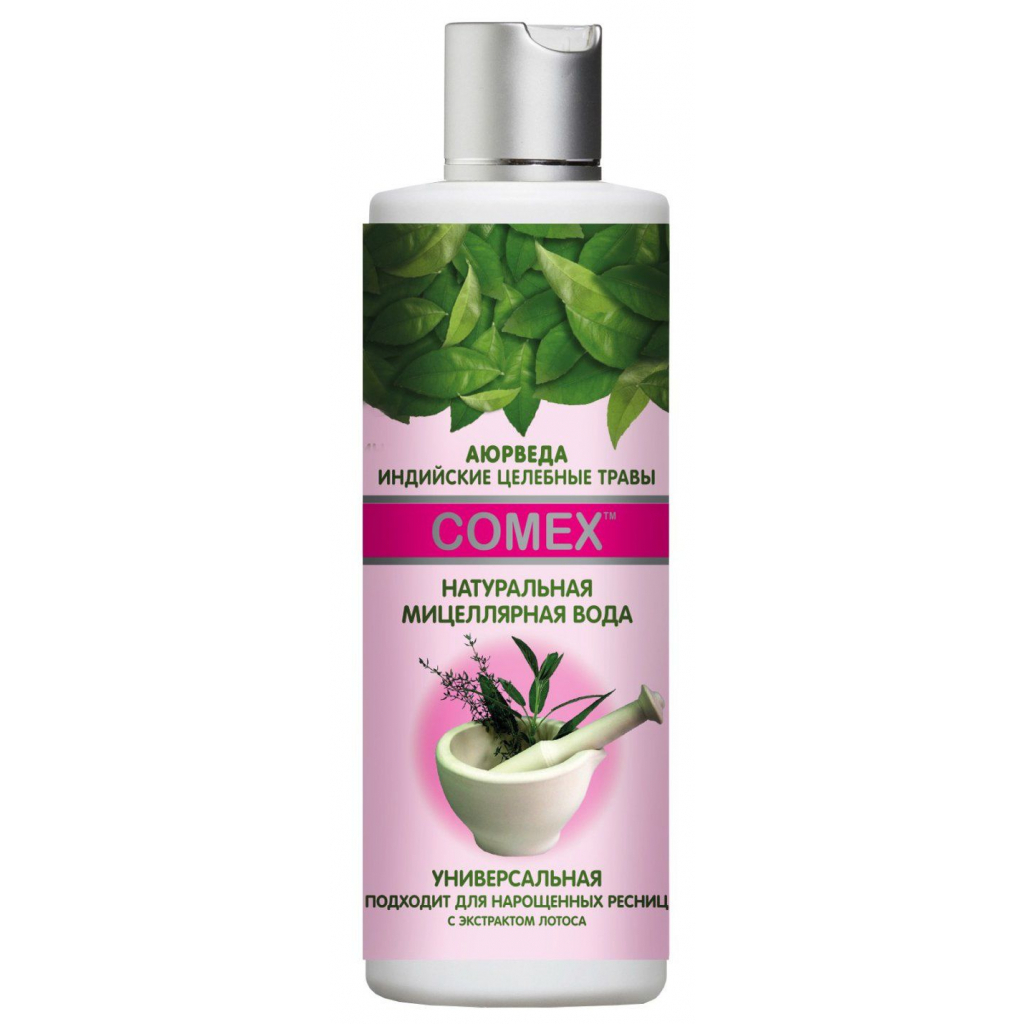 Міцелярна вода Comex на основі аюрведичних рецептів з екстрактами лотоса, органічного кокоса й індійських рослин. Делікатно очищає шкіру від макіяжу, забруднень і надлишків шкірного жиру, має омолоджувальний ефект, не викликає подразнення, підходить для всіх типів шкіри.