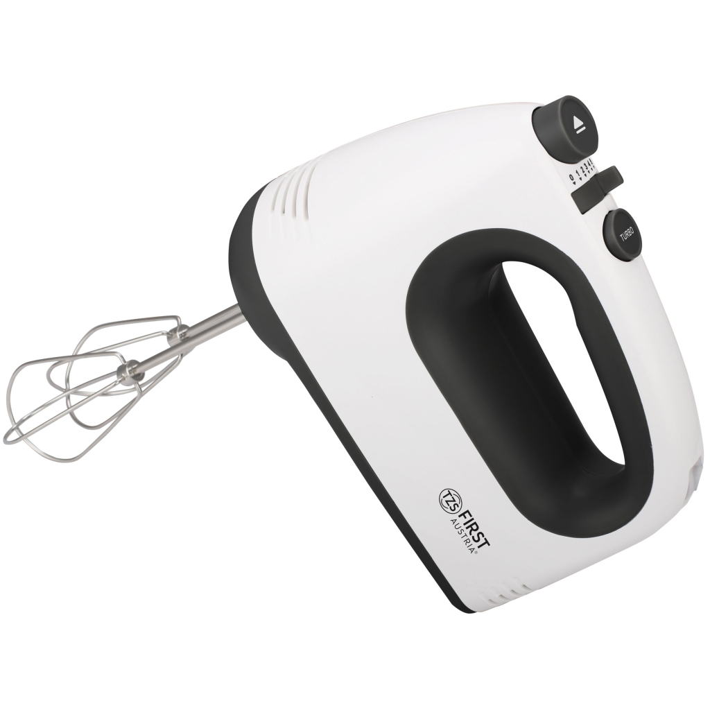 Міксер FIRST FA-5263-3 у легкому білому корпусі із пластику зручно лежить у долоні. Це дозволяє працювати їм довго без почуття втоми в руці. При потужності 300 Вт та наявності 5 швидкостей прилад ефективно змішує та збиває всілякі компоненти, робить основу для млинців, омлету, крем-супів та коктейлів. Інтенсивність обертання віночків та міксера можна регулювати довільно. Для максимальної продуктивності можна активувати турборежим. Для від'єднання насадок та їхньої легкої заміни в корпусі приладу передбачена лише одна кнопка.