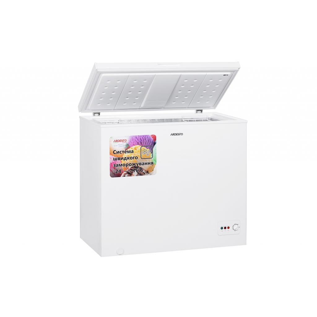 Морозильна скриня білого кольору з механічним керуванням та підтримкою роботи у режимі холодильника. Енергозбереження відповідає класу А+, а корисний об’єм складає 198 л.