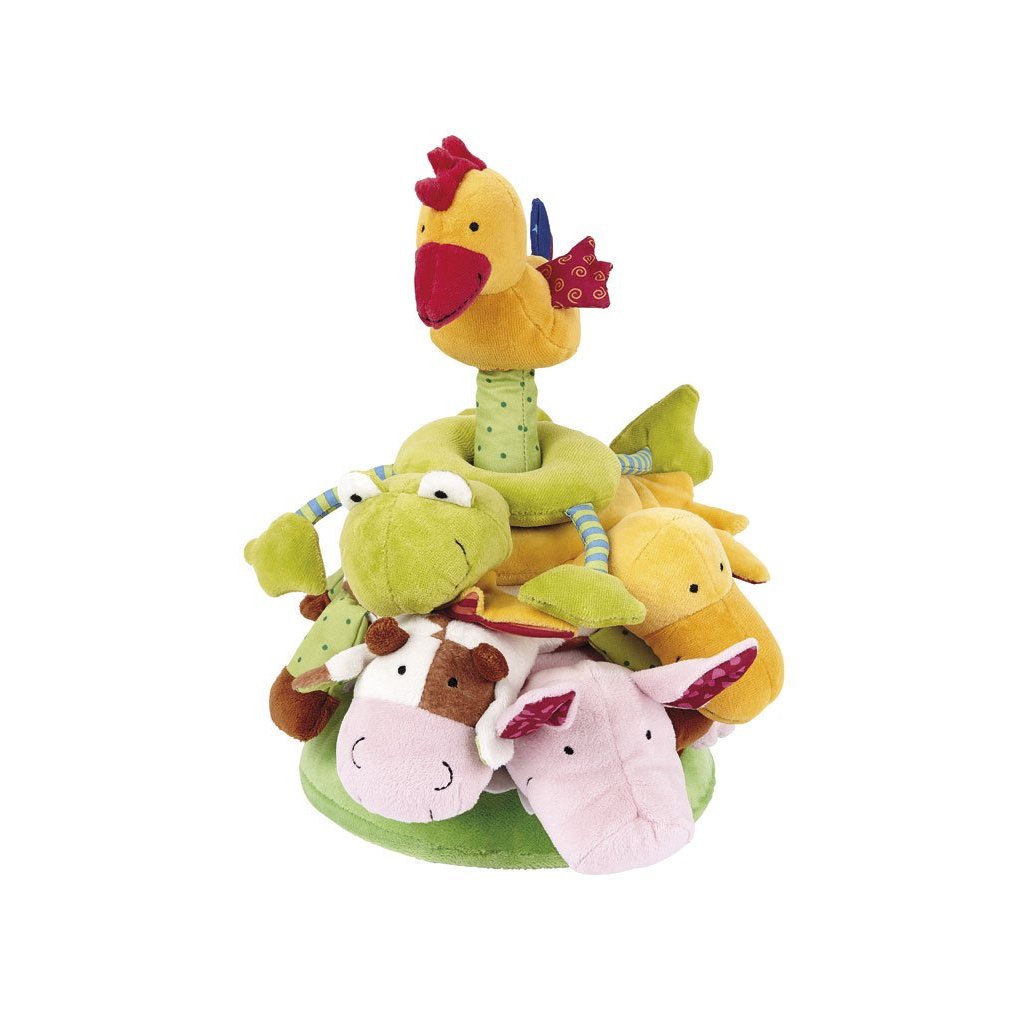 Не одна, а відразу кілька м'яких іграшок в одному наборі «Пірамідка з тваринами» від німецького бренду sigikid. З усіх іграшок в наборі дітки зможуть побудувати свою першу і саму м'яку пірамідку висотою 30 см. Кожна іграшка видає свій цікавий звук, який буде залучати дітей: дзвін, шелест, писк і дзвін. Всі звуки неголосні, приємні і прекрасно розвиватимуть сприйняття на слух.