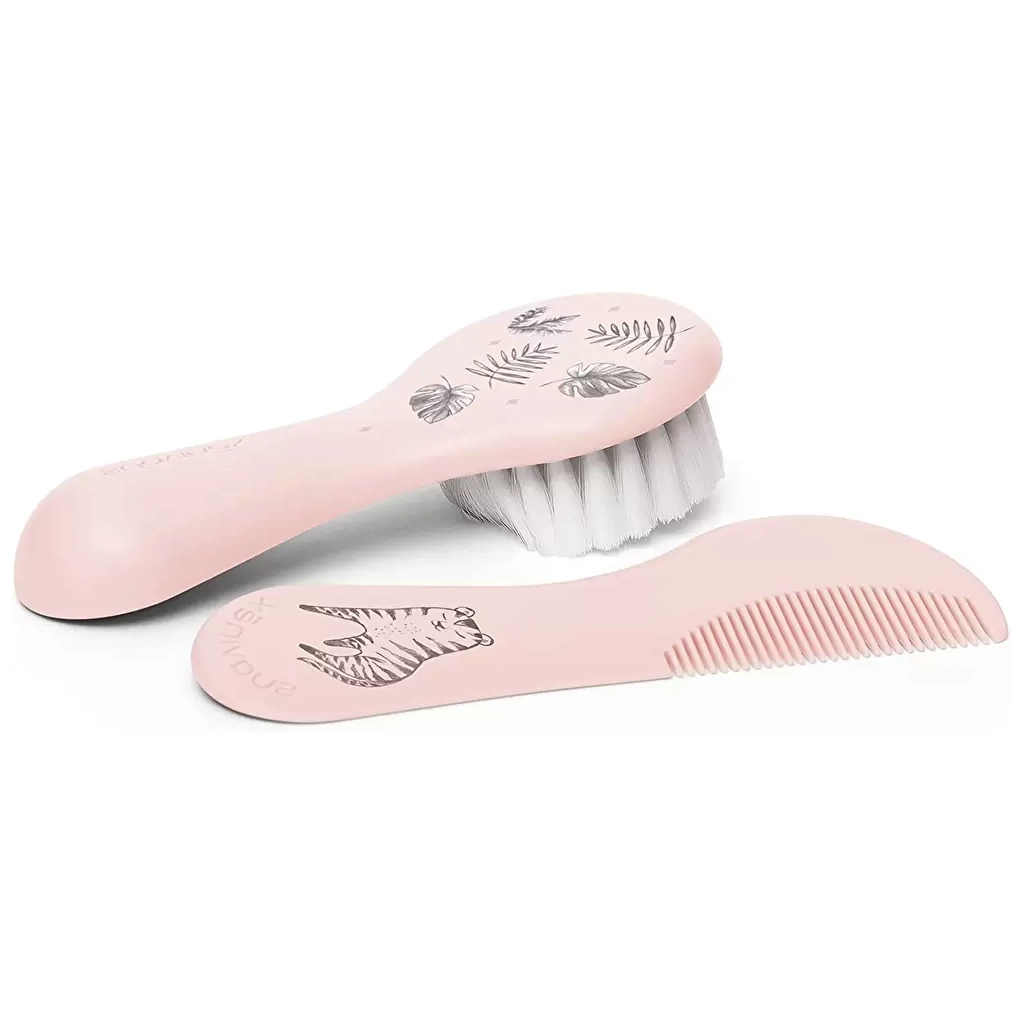 Набір гребінців від іспанської компанії Suavinex призначений для догляду за малюком, не пошкоджуючи його ніжну шкіру і волосся, завдяки заокругленим кінців на гребінці і м'яким волокнам на щітці.