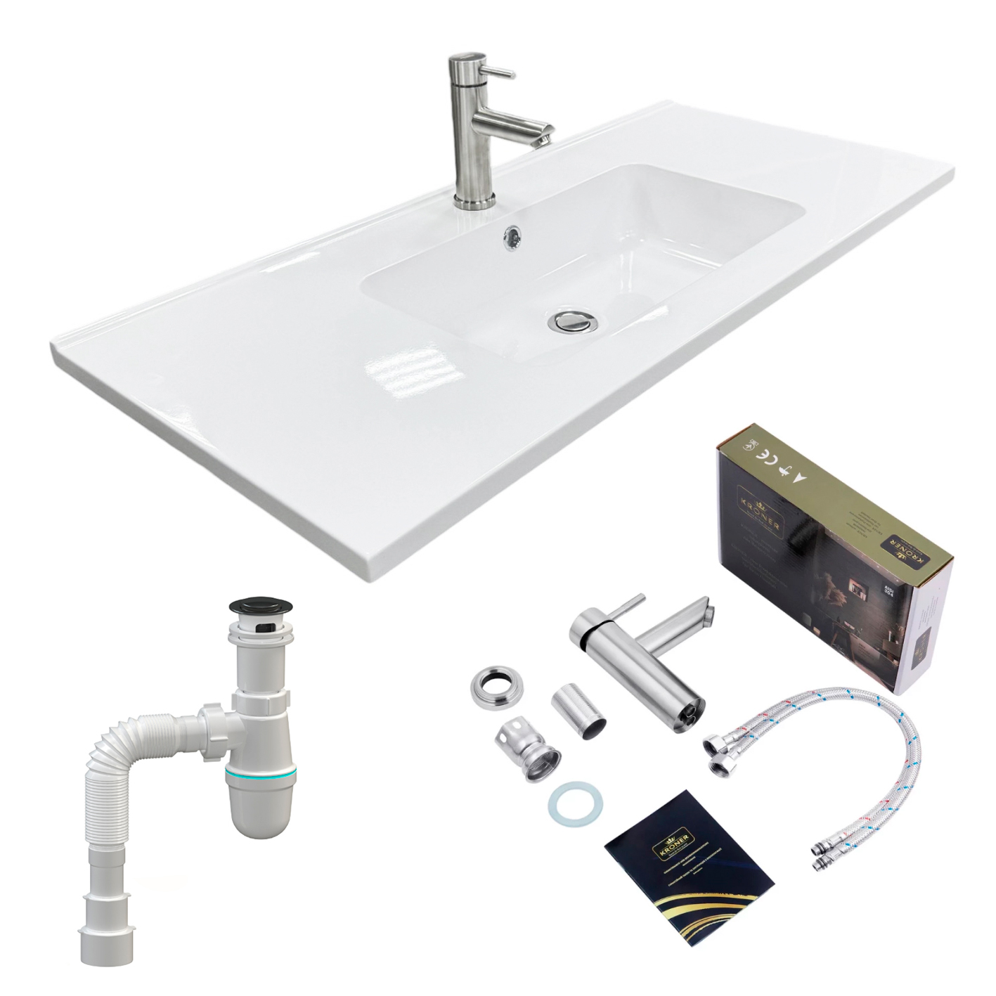 Набір для ванної кімнати, раковина, умивальник Adamant FLATE 100, штучний камінь, прямокутний із сифоном Click-Clack + змішувач