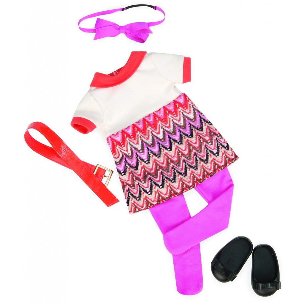 Головне правило у створенні власного оригінального стилю – не боятися експериментів. Набір одягу для ляльок Our Generation 46 см додає яскравих кольорів у палітрі гардеробу улюбленої ляльки, та обов’язково вирізнятиме її серед інших. Колготки та пов’язка для волосся насичено-рожевого кольору, оригінальна сукня з геометричним візерунком та акуратні чорні туфлі – довершений образ для яскравої події або тематичної вечірки. Одяг із комплекту виготовлений із якісного текстилю, тож є цілком безпечним для малюків та приємним на дотик. Окрім того, його можна комбінувати з іншими аксесуарами. Рекомендований вік: 3+.