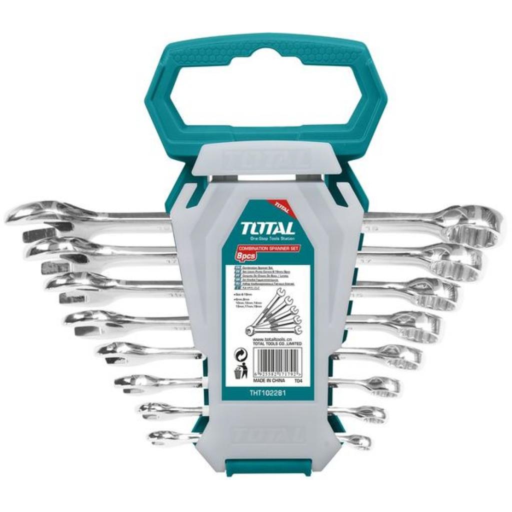 Набір ключів включає в себе 8 комбінованих гайкових ключів з накидними і ріжковими головками розміром 6мм, 8мм, 10мм, 12мм, 14мм, 15мм, 17мм, 19мм. Все включи виготовлені з високоміцного хром-ванадієвої сплаву і відмінно відполіровані. Для зручності зберігання і транспортування ключі поставляються в пластиковому підвісному футлярі.