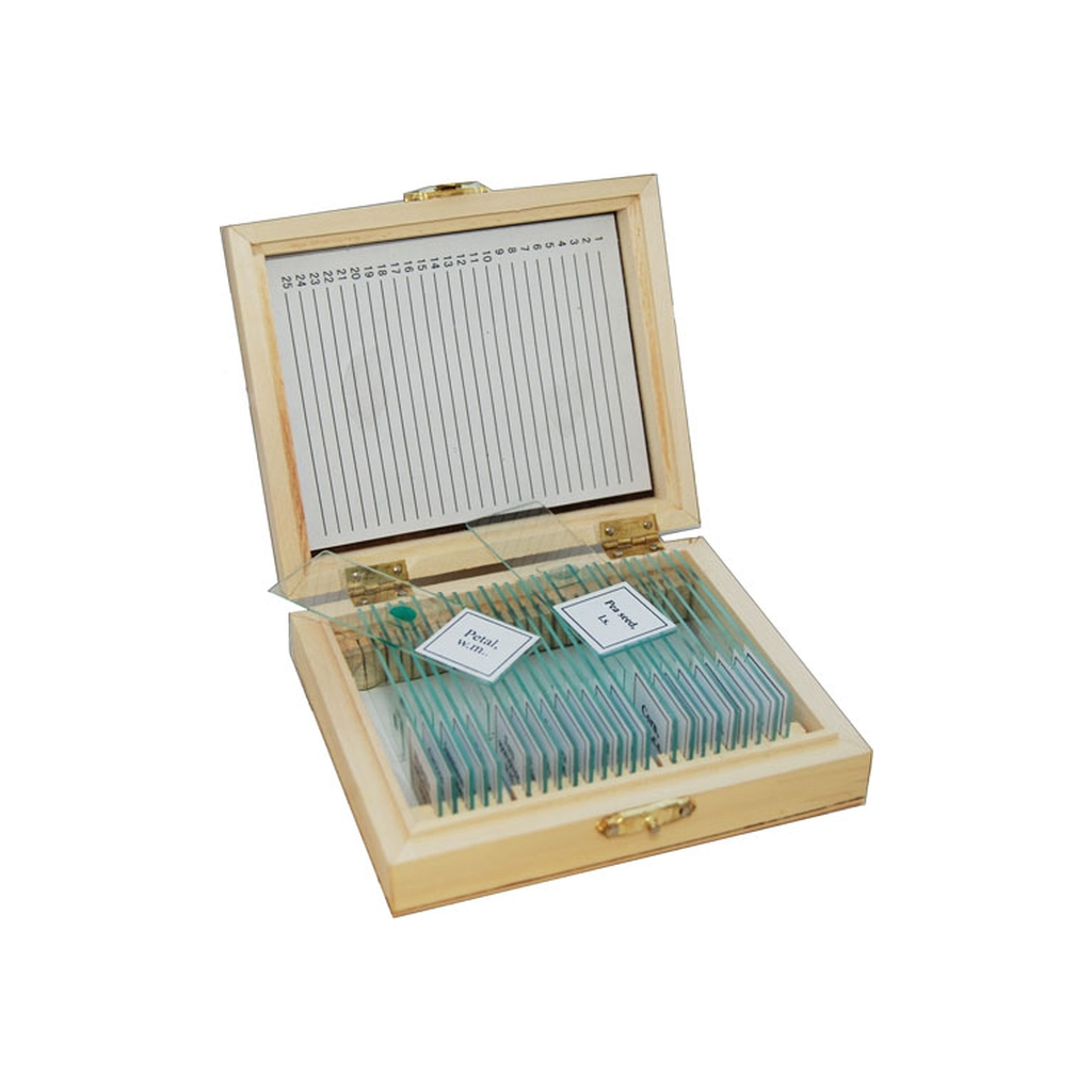 Опис:набір предметного скла у дерев'яній коробочці, Кількість зразків - 25 шт, 14 х 10.7 х 3.2 см, Частина - 1