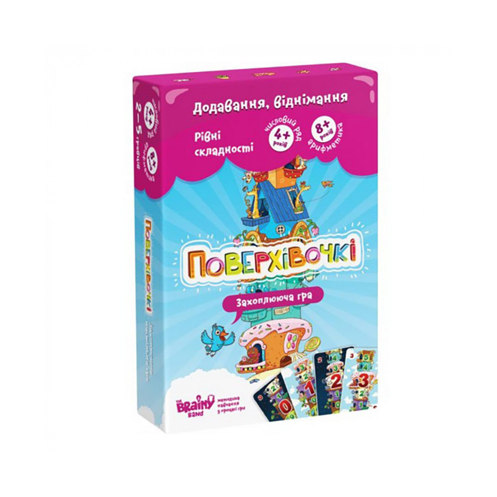 | Опис: | Барвиста гра «Поверхівочки» дозволяє швидко розібратися з числовим рядом і порядковим рахунком, допомагає освоїти прості математичні операції і зрозуміти, що таке перехід через десяток (що не так просто дається дітям). Яскраві карти і чарівні персонажі в цьому допоможуть! Місце дії гри - чарівний будинок, в якому живуть собаки-космонавти, допитливі жирафи, феї, принцеса та інші казкові персонажі. Кожен житель займає окремий поверх. Гравці переміщаються між поверхами, здійснюючи різні математичні дії і продумуючи стратегію. У наборі кілька типів карт, всі вони чудово ілюстровані. Діти з великим інтересом розглядають будинку-поверхівочки і їх мешканців: такі яскраві образи залишаються в пам'яті надовго. А в ході захоплюючої подорожі гравці вчаться швидко додавати і віднімати в розумі, освоюють додавання і віднімання через десяток. Малюкам від 4 років «Поверхівочки» допомагають познайомитися з поняттям числового ряду, а слідом швидко освоїти порядковий рахунок. Діти від 6 і від 8 років можуть переходити до середнього рівня складності і основним правилам. Тут їм належить складати, вичитати і «перестрибувати» через десяток. Це дозволяє поступово перейти від азів рахунку до вирішення простих арифметичних прикладів. Почати грати легко! На ігровому полі дві карти - карта з поверхом, на якому знаходяться гравці, і карта з повітряною кулею. Куля переміщує всіх на певну кількість поверхів вгору або вниз. У гравців на руках по шість карт, позбутися яких - мета кожного ходу. У свій хід гравець викладає карти поверхів в відповідну стопку ігрового поля, або залишаючись на тому ж поверсі, або переміщаючись вгору або вниз на число поверхів на карті з кулею. Карти куль можна викладати в будь-який момент ходу, задаючи тим самим нові умови. Хто зумів викласти всі карти - отримує зірку. Гравець, який набрав 5 зірок, стає переможцем! |