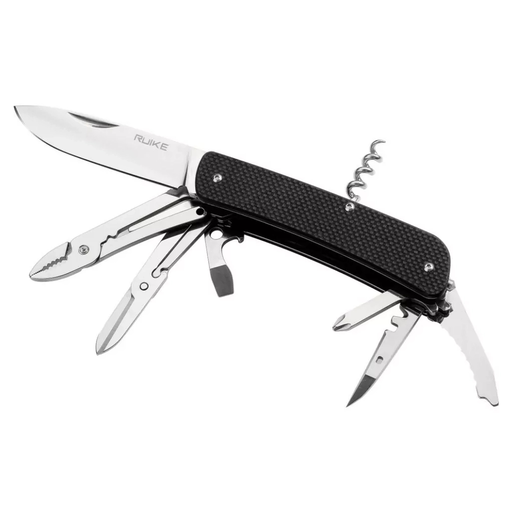 Для туристичних цілей найкраще підходить саме складаний ніж. Його зручно транспортувати, безпечно використати. Але особливо практичні для рибалок та туристів багатофункціональні моделі, наприклад, Ruike L41. Це якісний ніж із добре продуманим набором функціональностей. Він складається з кількох інструментів з однією загальною рукояткою, які можна використовувати по черзі. Але найголовнішим серед них є ніж. Розмір леза цього ножа становить завдовжки 85 мм. Товщина клинка по обуху не перевищує 3 мм. Вся його ріжуча кромка гладко заточена, що робить ніж універсальним у роботі з різними матеріалами. Крім того, доглядати гладко заточеним ножем простіше, ніж за серрейторним лезом.