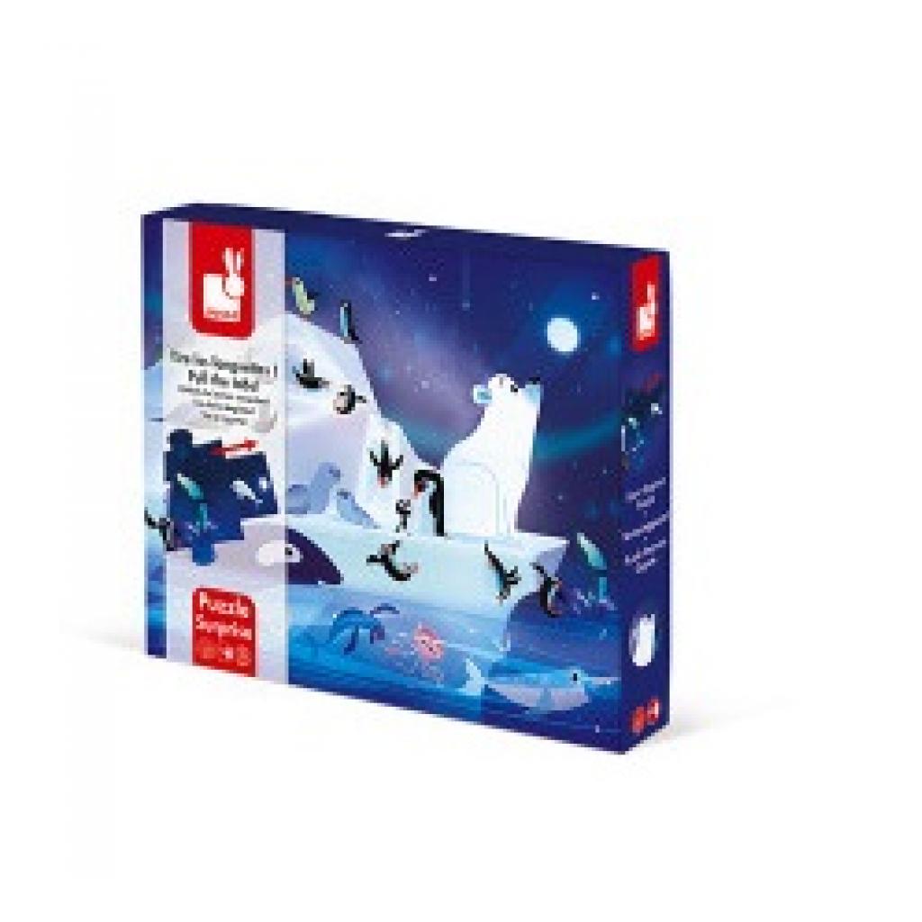 Пазл-сюрприз «Під зірками» неодмінно стане фаворитом для малюка. На що дивиться полярний ведмідь? Хто летить в арктичне небо? Хто плаває в океані? Що сховане за віконцями? Складається з 20 елементів та має 8 прихованих сюрпризів: 5 висувних деталей для збільшення за розміром пазлу та 3 віконця з прихованими ілюстраціями.
