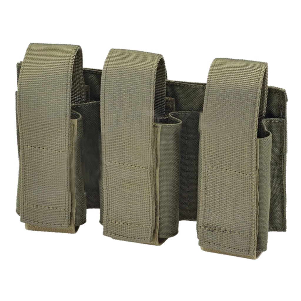 Defcon 5 Riple 40 mm Granade Pouche — компактний тактичний підсумок, призначений для носіння трьох уламових ручних гранат або аксесуарів. Модель виконана з міцного нейлону 1000D, здатного витримувати високі навантаження. Кишені закриваються на липучки та пряжки-фастекс. Підсумок обладнаний системою кріплення MOLLE.
