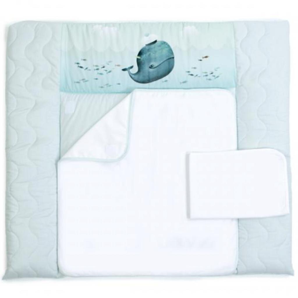 Сповивальний матрац Menthol whale 72*80 без жорсткої основи. М’яка та приємна на дотик поверхня та м’який наповнювач виробу створює максимальний комфорт при використанні (перевдягання, зміна підгузку, масажі, «повітряні ванни» тощо). Розмір матрацу розрахований на розмір сповивального місця комодів-пеленаторів виробництва «Верес». Також може використовуватися на будь-якій іншій поверхні.