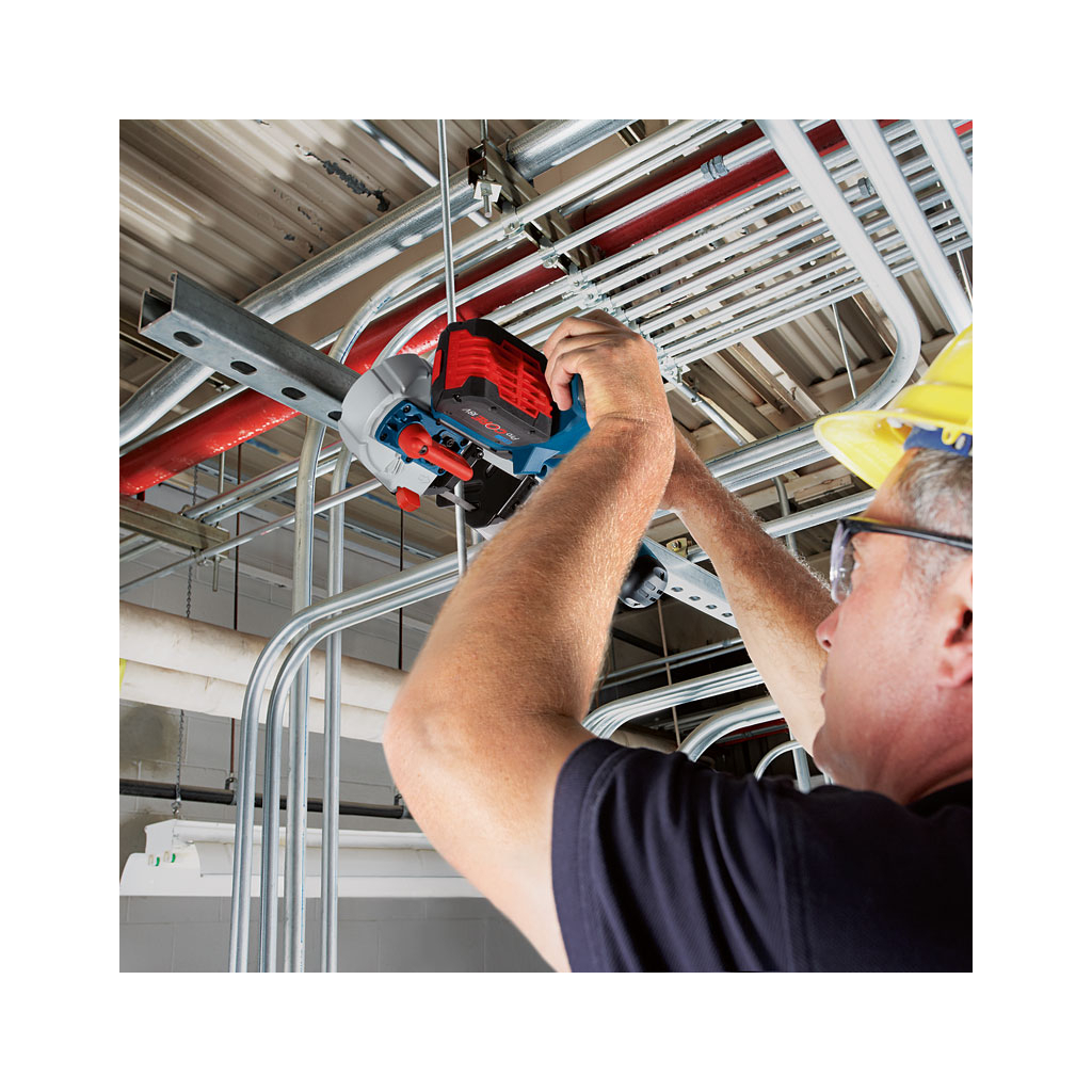 Акумуляторна стрічкова пилка GCB 18V-63 - найергономічніша і найкомпактніша акумуляторна стрічкова пилка від Bosch. Легкість інструменту забезпечує комфортну роботу навіть у обмеженому просторі. Швидка заміна пильних полотен здійснюється завдяки пристрою для зняття натягу леза та стандартному захисному пристрою з металевими затискачами. З цією стрічковою пилкою комфортно працювати: від безшумного ходу пиляльного полотна для зручного звернення до освітлення робочої зони світлодіодним підсвічуванням.