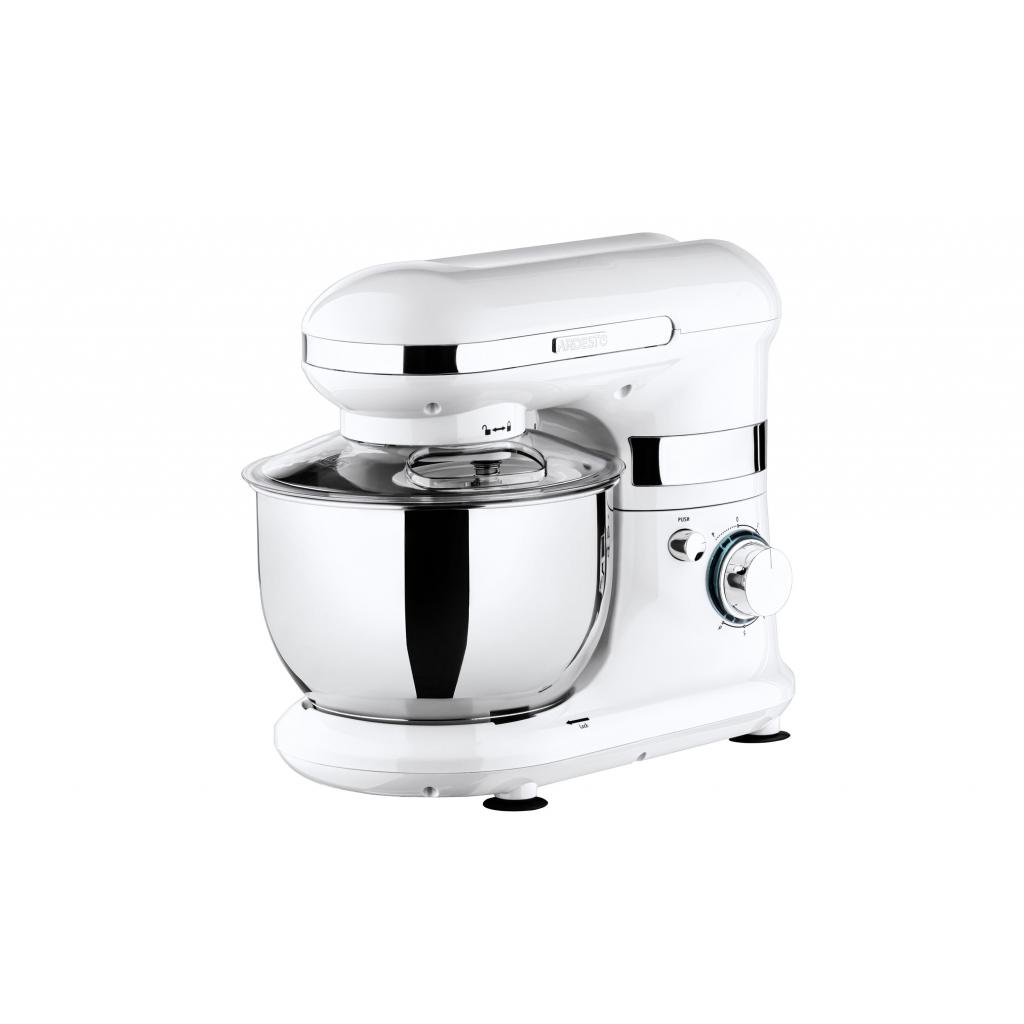 Міксер виконано у ергономічному корпусі з міцного пластику та доповнено хромованими елементами. Чаша на чотири літри вироблена з нержавіючої сталі, а насадки – як з пластику, так і з металу. Вінчик та А-подібна насадка призначені для збивання крему та інших інгредієнтів з рідкою консистенцією, а гачок для замісу тіста. Прозора знімна кришка захищає від бризок, а для вилучення насадок є спеціальна клавіша. Двигун з потужністю 800 Вт захищено від перегріву, передбачено шість режимів швидкості, а також режим Pulse. Для керування використовується зручний важіль, а для стійкого встановлення є ніжки-присоски.