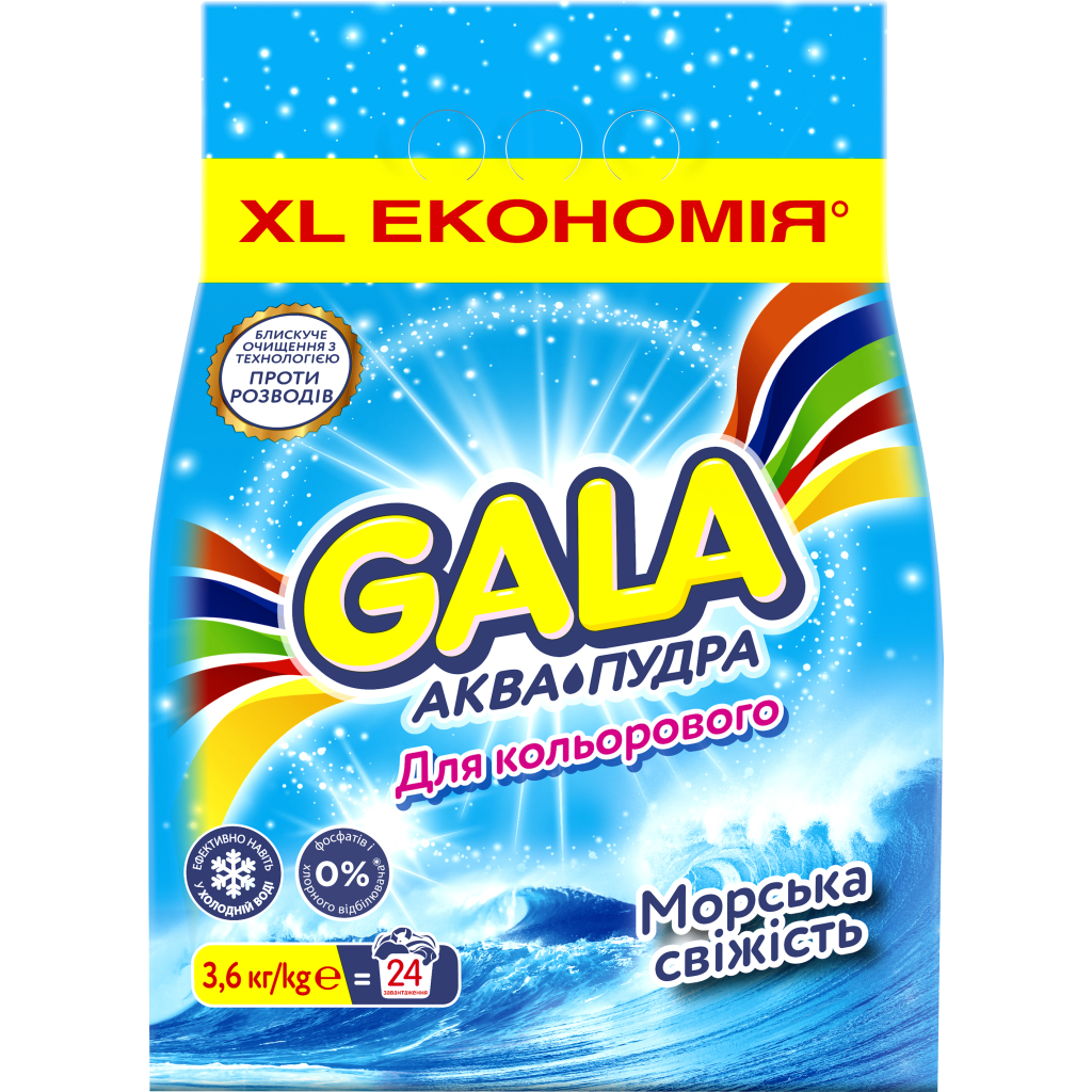 Завдяки Gala більше немає потреби витрачати зайві гроші, щоб Ваші речі були чистими та свіжими. До складу також входять компоненти, що запобігають накипу, що важливо для продовження терміну служби пральної машини.