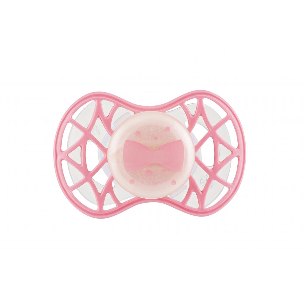 Ортодонтична пустушка Air55 Cool, яка світитися в темряві. Пластина соски на 55% складається з повітря забезпечуючи майже повну аерацію області навколо рота, уникаючи скупчення слини, яка може дратувати шкіру. Захисний ковпачок для соски для підтримки чистоти соски і стерилізації в мікрохвильовій печі простим додаванням води.