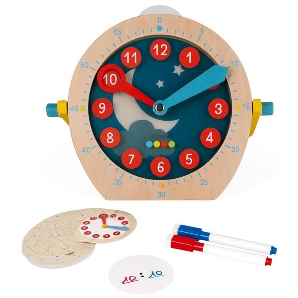 Котра зараз година? Цей навчальний набір французького бренду Janod призначений для всіх дітей, які вивчають час і його хід. Дерев'яний годинник має ручку-опору (можна використовувати для перенесення) і регульовані стрілки, які дуже плавно рухаються. У наборі також є картки (14 шт.) і маркери (2 шт.) завдяки яким діти також можуть потренуватися.