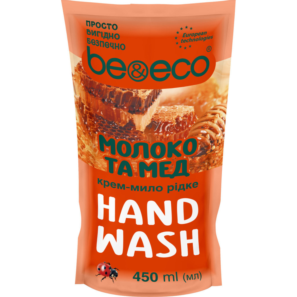 Рідке мило Be&Eco З антибактеріальним ефектом Молоко та мед дой-пак 450 мл (4820168435034)