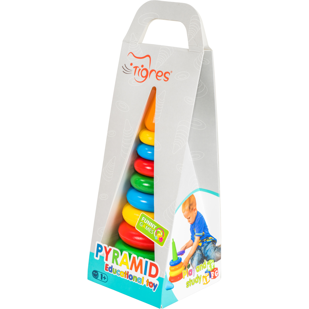 | Опис: | Пірамідка складається з 8 кілець різного розміру і кольору, нанизаних на вісь з основою, і ковпачка. Кільця пірамідки мають приємну поверхню, їх зручно тримати в маленьких долоньках. Знімаючи і нанизуючи кілечка на основу, малюк знайомиться з формою і розміром предметів, вчиться просторово мислити, розпізнавати кольори і вивчає кількісний рахунок. Складається з 11 елементів. |