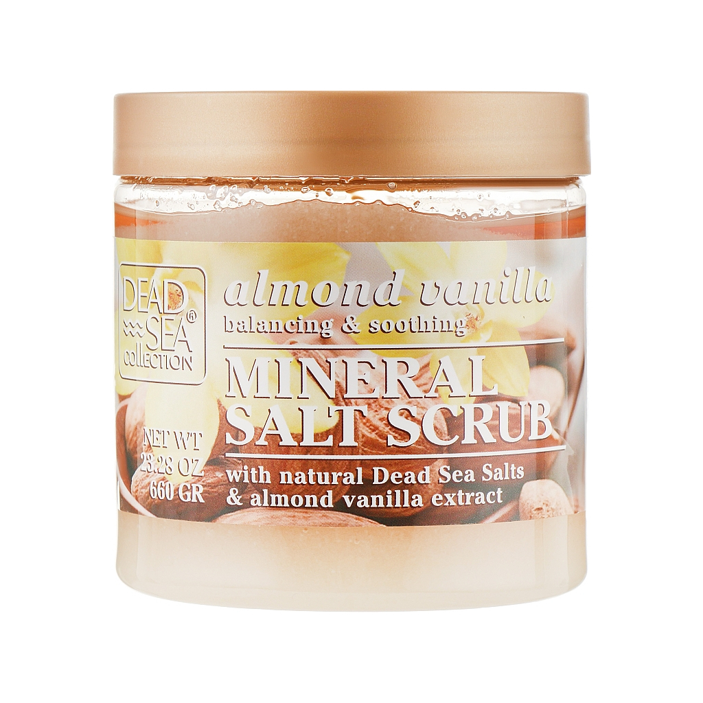 Чудовий натуральний скраб Dead Sea Collection з крупинками солі Мертвого моря, олією мигдалю і ванілі, що тануть на шкірі, прекрасно пом'якшує і зволожує шкіру, надає їй гладкість і еластичність, підтримуючи природний гідроліпідний баланс.