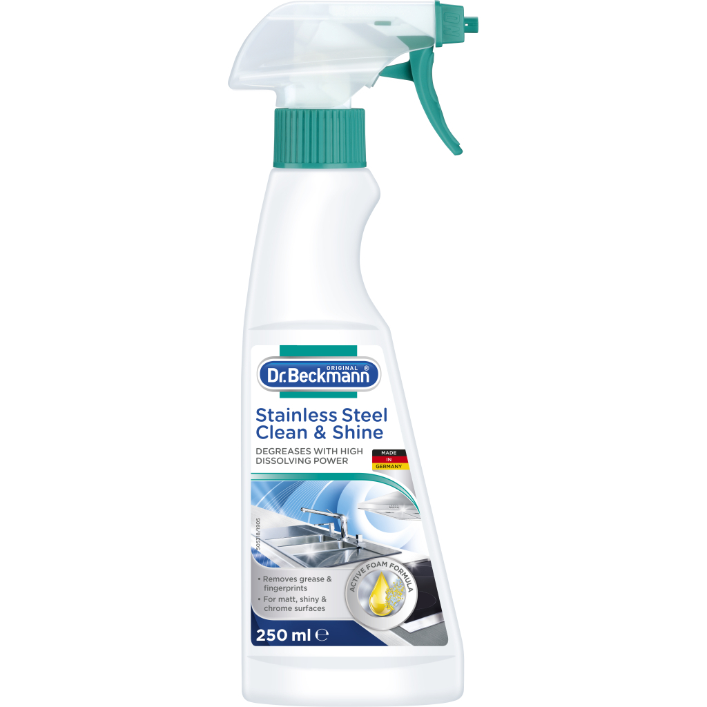 Dr. Beckmann Піна для чищення нержавіючої сталі була розроблена для ефективного, який не залишає смуг і щадного матеріалу видалення відкладення жирів, слизу, плям води і бруду, а також слідів або відбитків пальців на матових і блискучих поверхнях з нержавіючої сталі. При очищенні нержавіючої сталі або хрому забезпечує догляд і захист інгредієнтів поверхні і надає їй блиск. Dr. Beckmann Піна для чищення має широкий спектр застосування, може використовуватися для очищення алюмінію, скла та пластику.