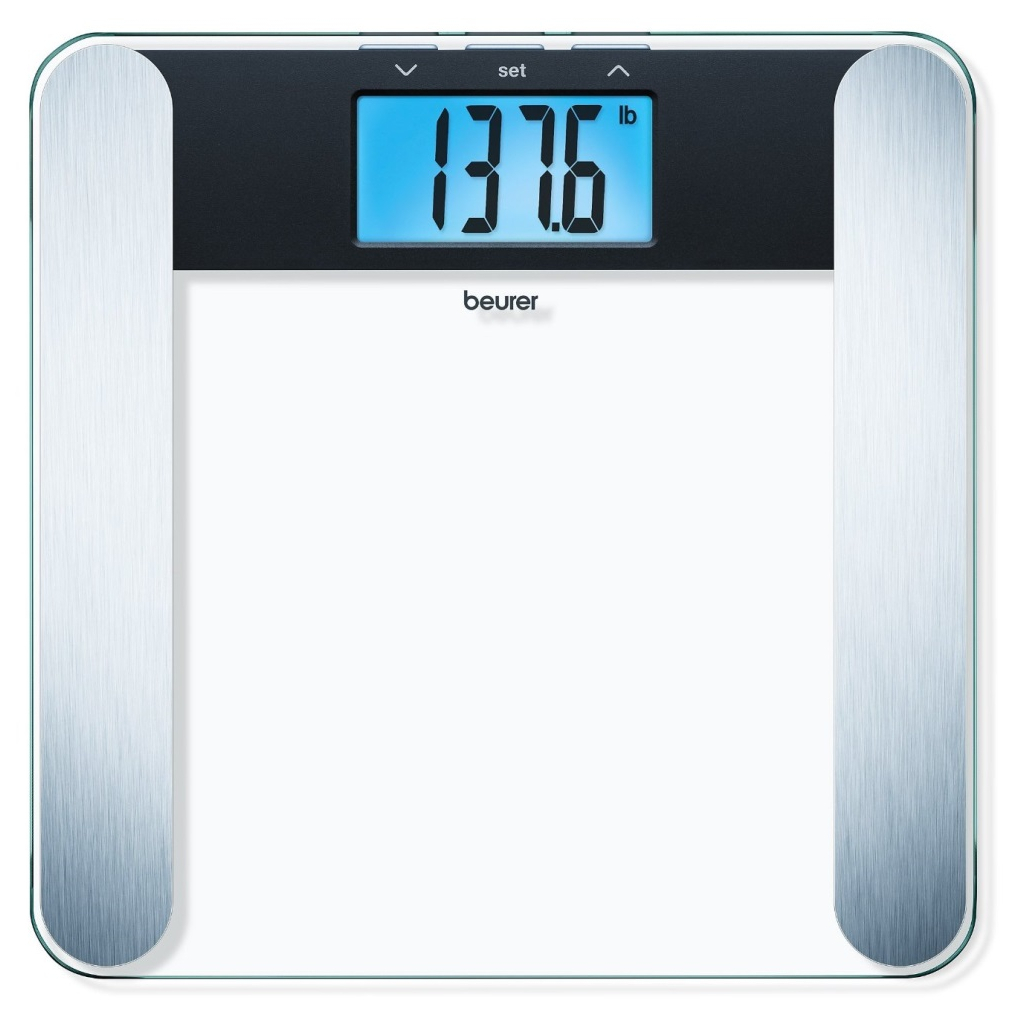Велика опорна поверхня зі скла товщиною 8 мм. Дуже великий дисплей з синім підсвічуванням. Вага, жирова і кісткова маса, частка вологи і м'язової тканини. Електроди з полірованої нержавіючої сталі. П'ять рівнів активності. Технологія включення Quick Start. Автоматичне вимикання, індикація перевантаження. Максимальна вага 180 кг. Розмір цифр 40 мм.