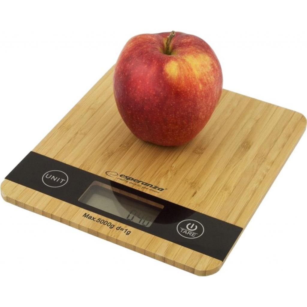 Компактні кухонні ваги EKS005 від компанії Esperanza з максимальним навантаженням в 5 кг і кроком вимірювання 1 грам, оснащені плоскою платформою з дерева і дозволяють проводити обнулення тари. У моделі використовується добре видимий цифровий дисплей. В якості елементів живлення використовуються три батарейки типу ААА (не поставляються в комплекті).