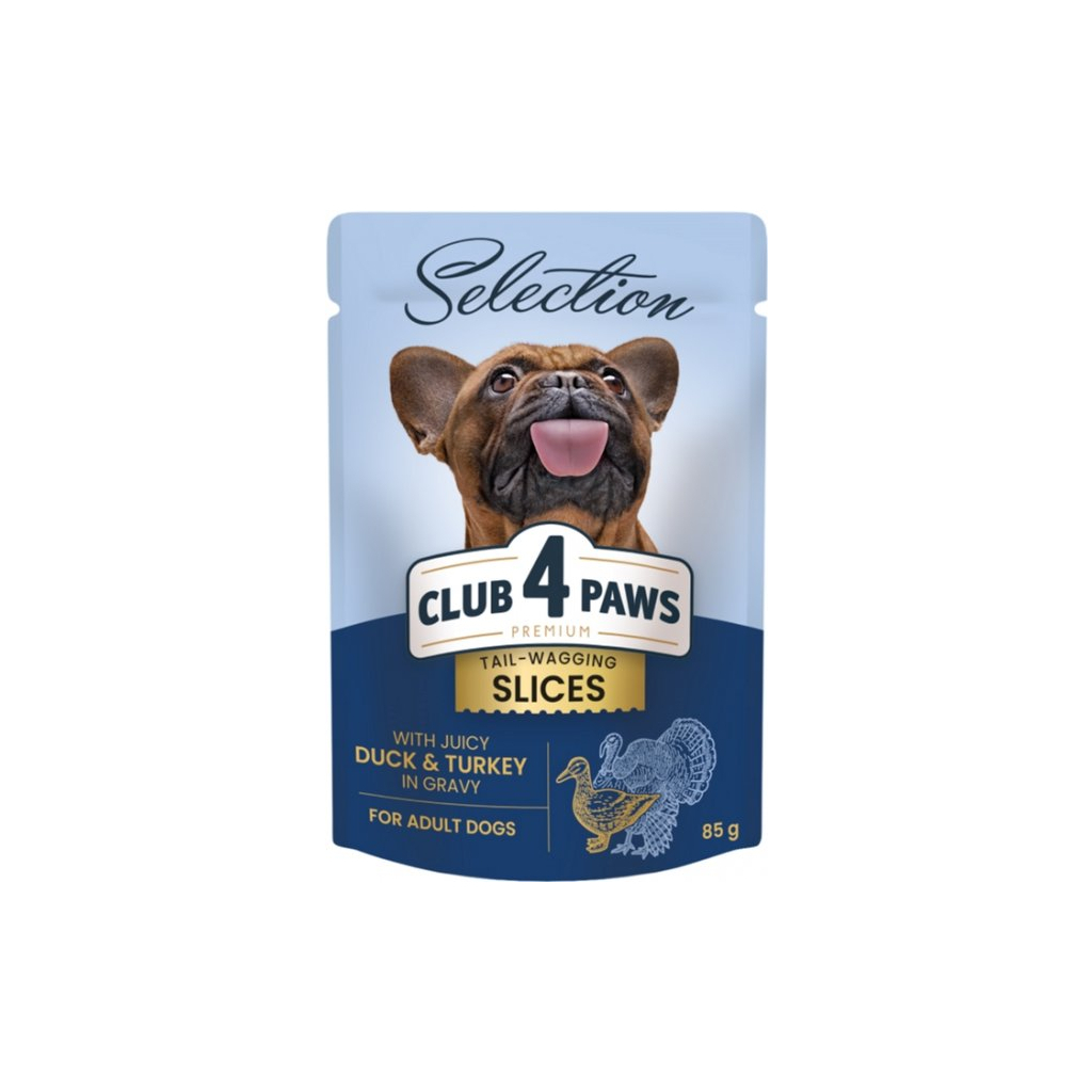 Кажуть, песики виляють хвостиком удвічі привітніше, коли бачать упаковку CLUB 4 PAWS SELECTION. Ніжна текстура м’ясних шматочків з апетитною підливкою, яку так і хочеться злизати швидше. А потім — ну, як завше! — вилизати ваше обличчя на знак своєї прихильності.