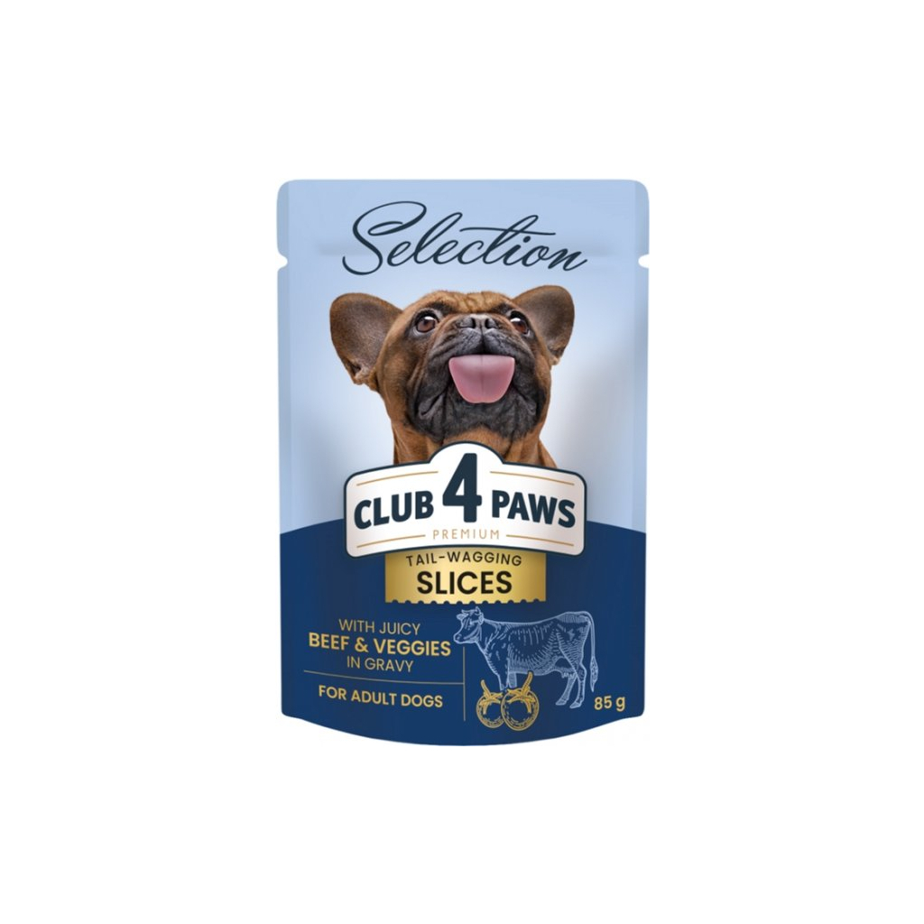 Кажуть, песики виляють хвостиком удвічі привітніше, коли бачать упаковку CLUB 4 PAWS SELECTION. Ніжна текстура м’ясних шматочків з апетитною підливкою, яку так і хочеться злизати швидше. А потім — ну, як завше! — вилизати ваше обличчя на знак своєї прихильності.