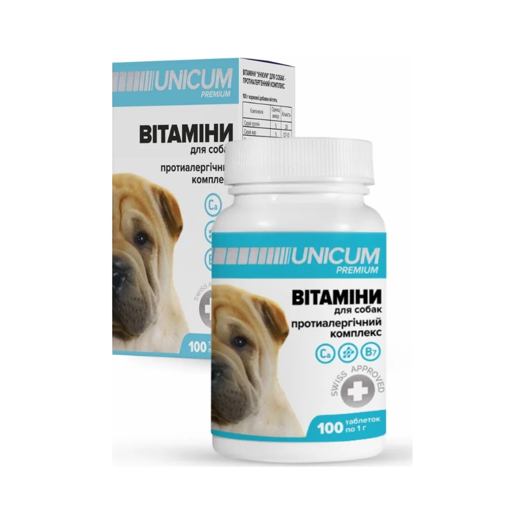 Вітаміни для собак Unicum PREMIUM протиалергічний комплекс 100 табл. (4820150202620)
